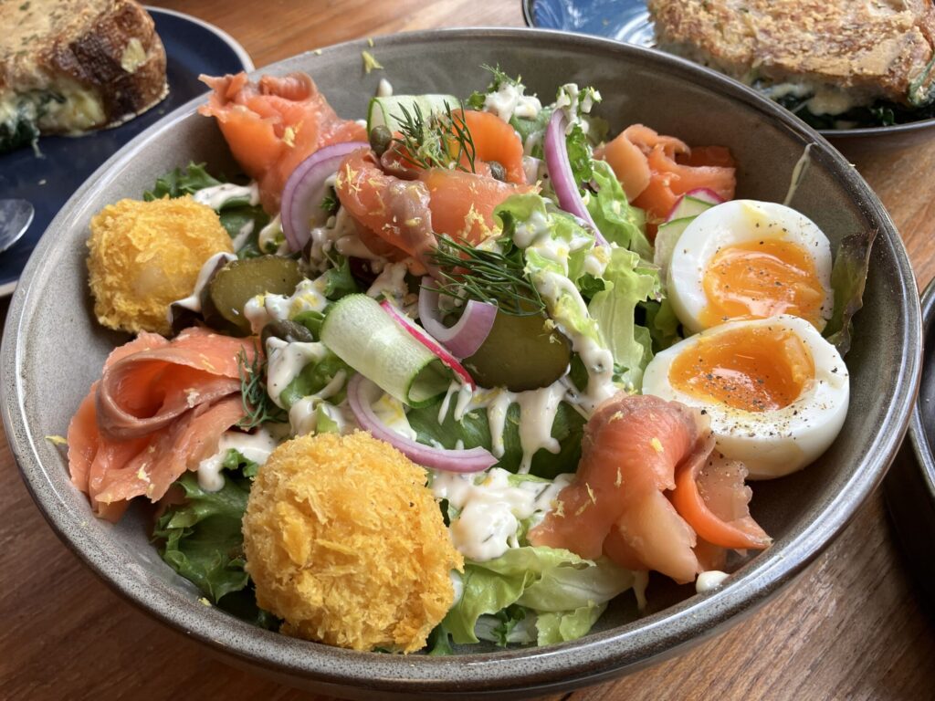 木々に囲まれたオアシスのようなカフェ。ゆったりとした庭で食べる朝食は、旅の疲れをふっと和らげてくれます。洋食系メニューが豊富で、エッグベネディクト、フレンチトースト、サラダなど外れなし。